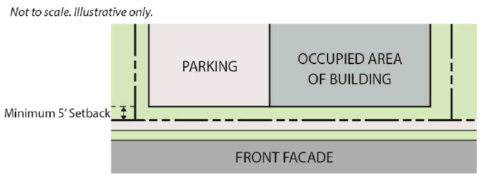 As illustrated in Figure 4.13, ground level or above grade structured parking shall be a minimum of five (5) feet from a street or river front façade.