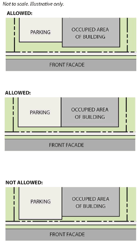 As illustrated in Figure 4.14, ground level structured parking shall not extend beyond the front façade of the occupied portion of a building on a street front.
