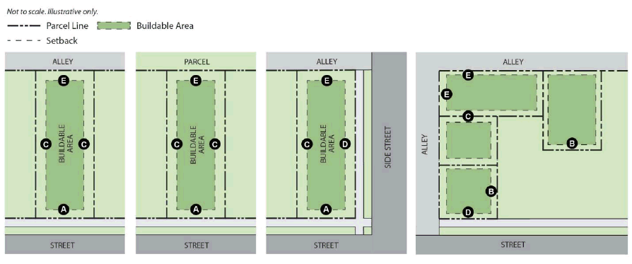 Setbacks. Required setbacks shall be as established in Table 17.04.040.A.2 and illustrated in Figure 4.17, and Figure 4.18.