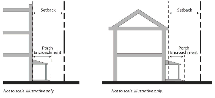 Setback encroachment. As illustrated in Figure 4.19, porches, patios, and stoops are permitted to encroach into required setbacks a maximum of four (4) feet.