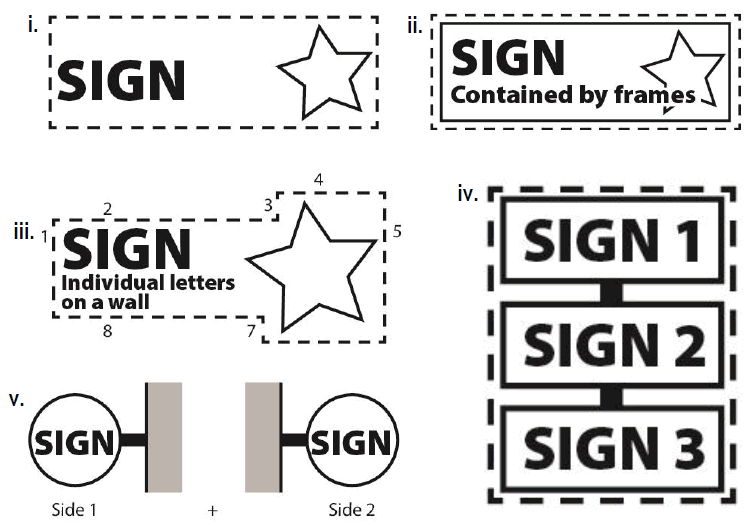 Each area of a sign that can be enclosed by a line or an imaginary line shall be considered one (1) sign. Each side of a two-sided sign shall be used to calculate the maximum allowed sign area.
