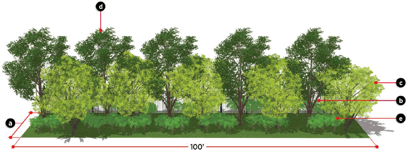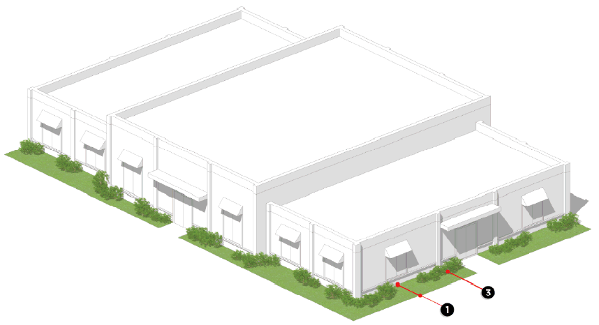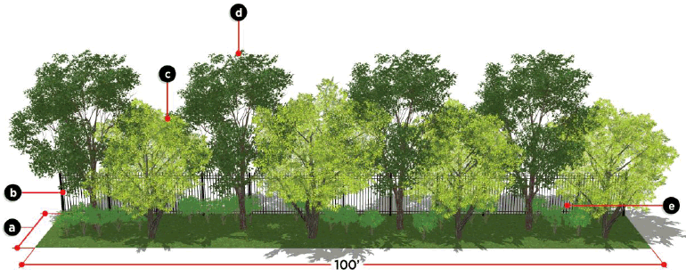 Shrubs or native grasses installed every three (3) feet along the exterior of the wall or fence to provide a softening effect.