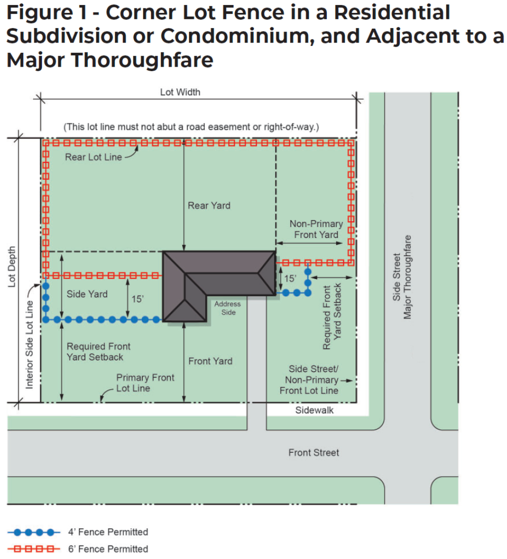 Side street line adjacent to a major thoroughfare. Where a corner lot or cul-de-sac lot in a residential subdivision or condominium has a non-primary front lot line adjacent to a major thoroughfare and is not accessed by this major thoroughfare, a fence may be constructed up to a height of six feet in the non-primary required front yard setback area only between the rear lot line and 15 feet behind the front corner of the home on that side, provided the lot does not have its address from the major thoroughfare and that the rear lot line does not abut a road easement or right-of-way. (See Figure 1, below)