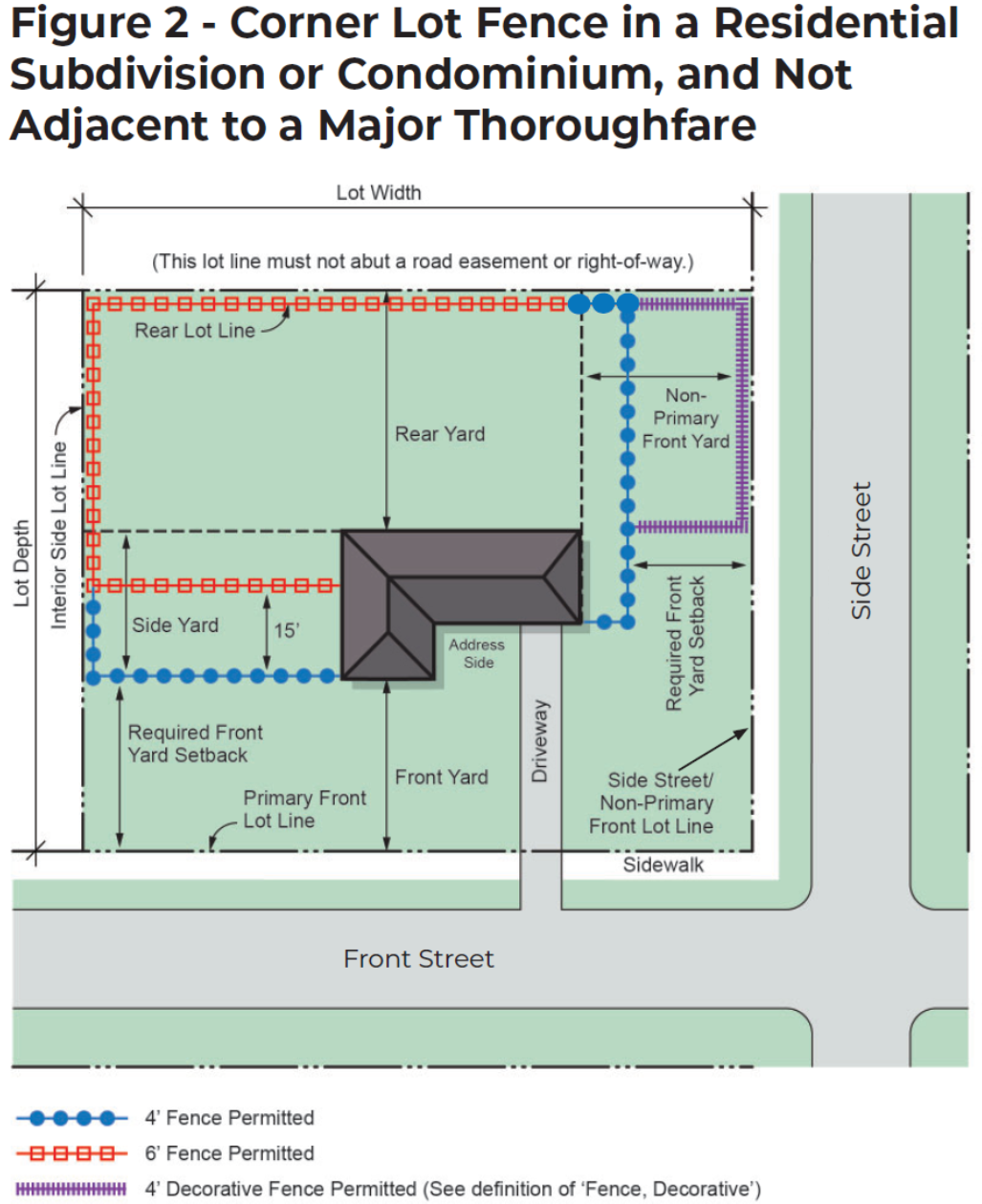 Other side street lines. Where a corner lot or cul-de-sac lot in a residential subdivision or condominium has both front lot lines adjacent to streets that are not classified as major thoroughfares and its non-primary front yard is not accessed by the adjacent side street, a fence may be constructed up to a height of four feet in the non-primary required front yard setback area only between the rear lot line and the rear corner of the home, provided the fence is a decorative fence as defined in this ordinance and the rear lot line does not abut a road easement or right-of-way. (See Figure 2, below)