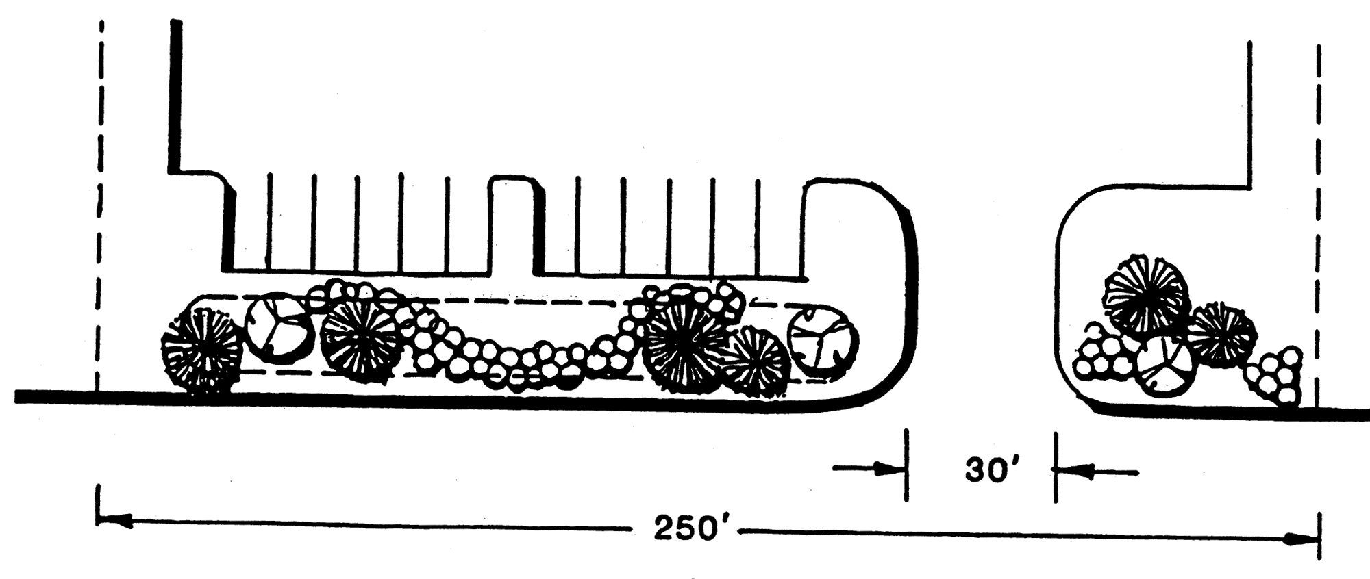 Landscaping of divider medians. Where traffic on driveways, maneuvering lanes, private roads, or similar vehicle accessways is separated by a divider median, the median shall be curbed and have a minimum width of 12 feet as measured from the back of curb. A minimum of one deciduous or evergreen tree shall be planted for each 30 lineal feet or portion thereof of median. Trees may be planted at uniform intervals, at random, or in groupings, but in no instance shall the center-to-center distance between trees exceed 60 feet.