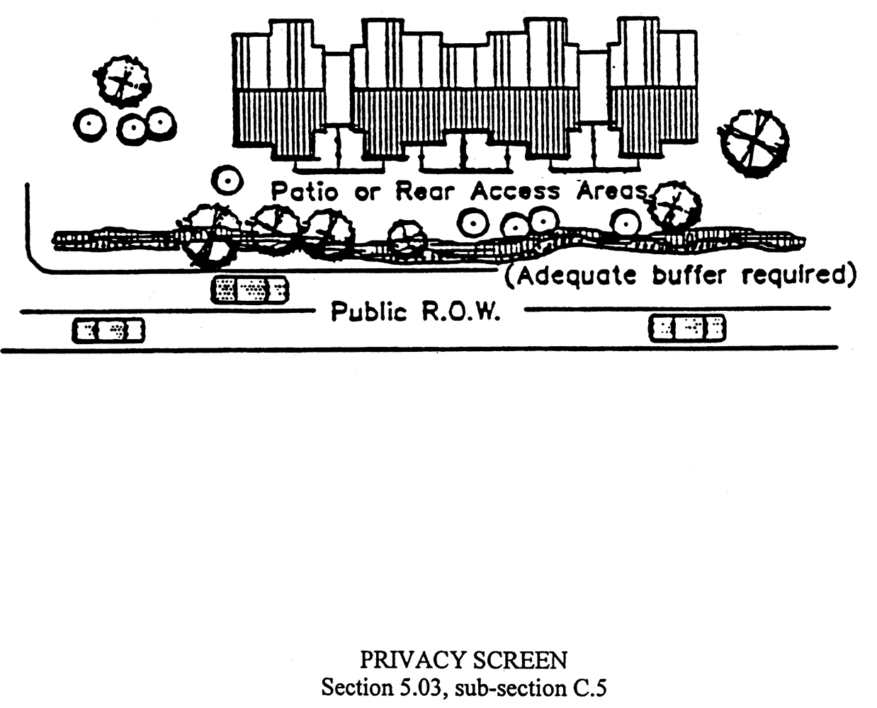 Privacy screen. Where multiple-family dwellings are designed so that rear open areas or patio areas front onto a public street, a landscaped privacy screen shall be provided (see illustration). Such screen may consist of a combination of trees, shrubs, and berming, subject to review by the planning commission.