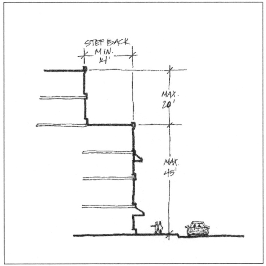 Stepback: A stepback is a setback located on the upper stories of a building, typically to reduce the bulk of a building or to provide outdoor floor space.