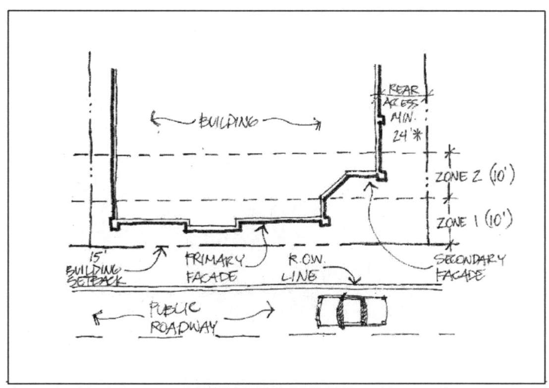 Simplicity: Design Guidelines and Standards for the district shall provide for public convenience by clearly identifying the nature of the business and communicating points of ingress and egress for pedestrian and automobile traffic. These issues can be addressed through architectural treatments as well as through site planning considerations such as the location of parking lots, lighting, signage and landscaping.