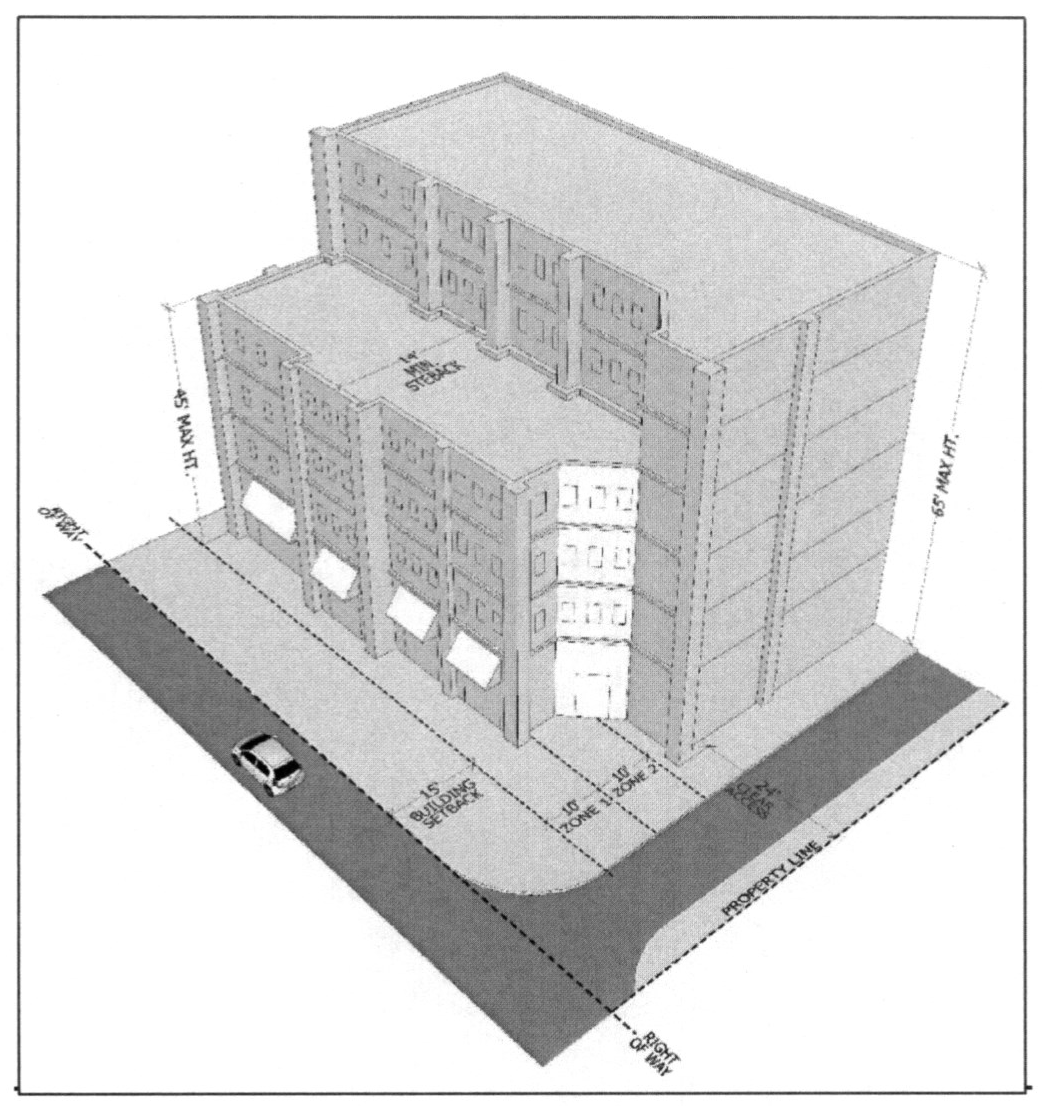 Building zone: A zone within a property along a street frontage which defines the limits of where the building façade must be located. This zone is generally parallel to the right-of-way and is defined by a minimum and maximum distance from the right-of-way.