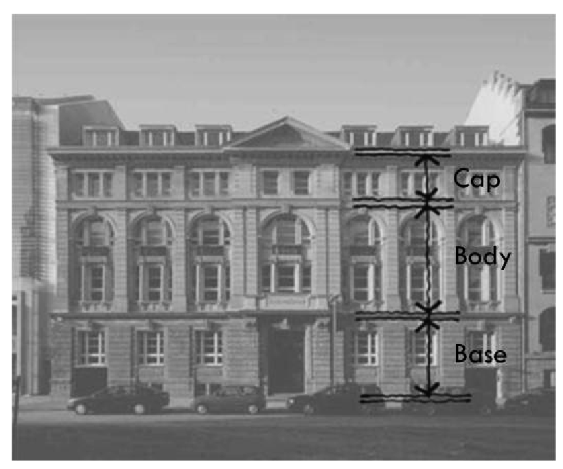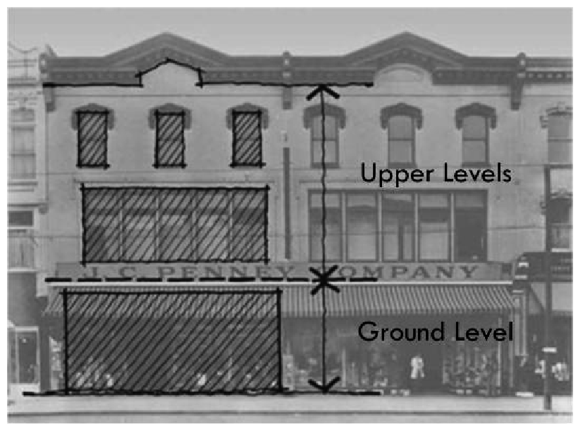 Building façade: The portion of the building wall that is visible to the public. This includes all four sides of the building.