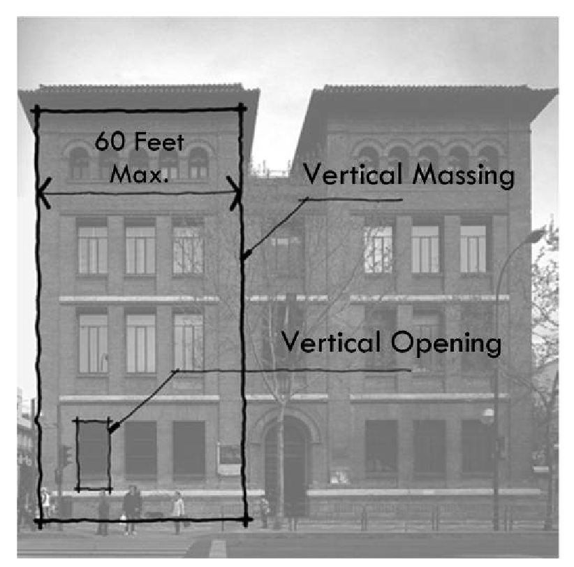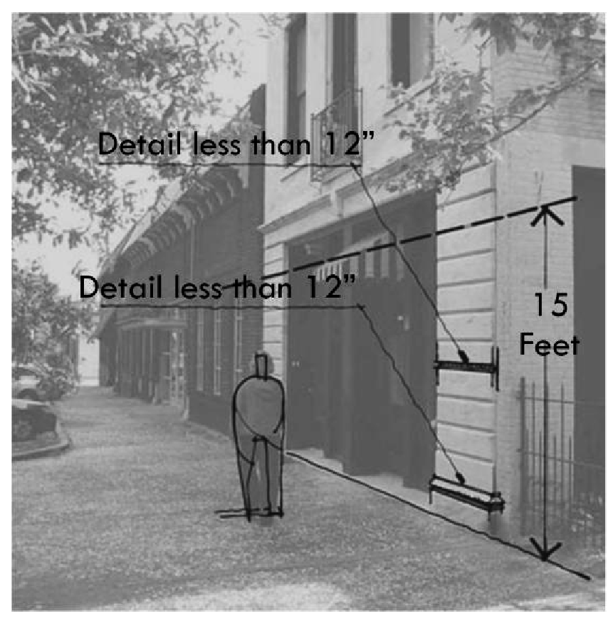 Pedestrian orientation: Pedestrian orientation can be achieved through storefront ornamentation, reduction of blank surfaces, building articulation, proportion, rhythm, color, and texture. Standards based upon this principle address wall surfaces, windows, awnings, signage, and architectural treatments.