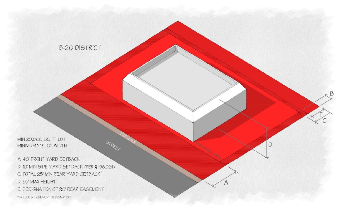 All buildings and parking areas shall be set back at least 20 feet from all adjoining property lines;