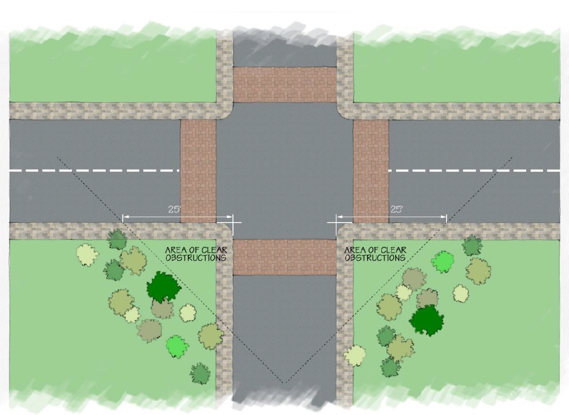 On a corner lot in any district, no planting, structure, fence, wall or obstruction to vision more than three feet in height measured from the centerline of the street shall be placed or maintained within the triangular area formed by the intersecting street lines and a straight-line connecting points on the street lines, each of which is 25 feet distance from the point of intersection.