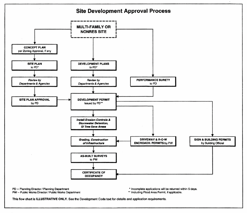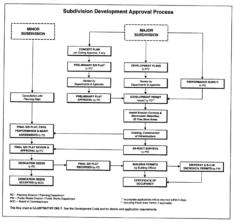 A development permit is issued by the planning and community development department based on review and approval of development plans for construction of the subdivision.