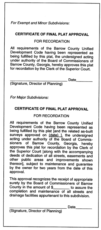 Approval of a final subdivision plat by the planning and community development department will authorize recordation of the plat with the Clerk of the Superior Court.