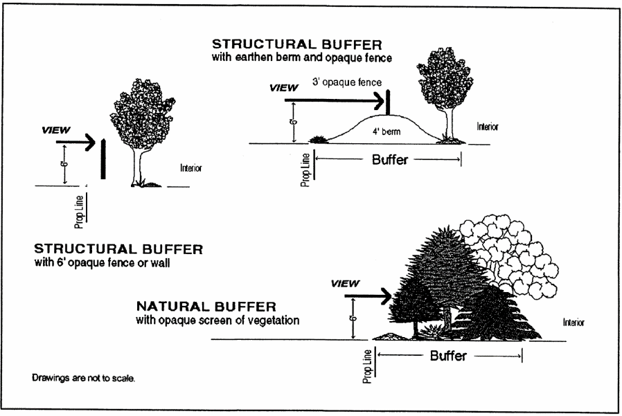 The accompanying Figure 21 provides examples of natural and structural zoning buffers. Other solutions meeting the minimum requirements of this section are also acceptable.