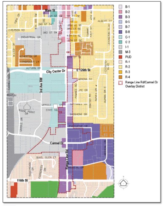 The City’s intent in establishing the Range Line Road Overlay District is to provide a consistent urban design treatment throughout the Range Line Road Overlay District; provide additional opportunities for real estate investment and