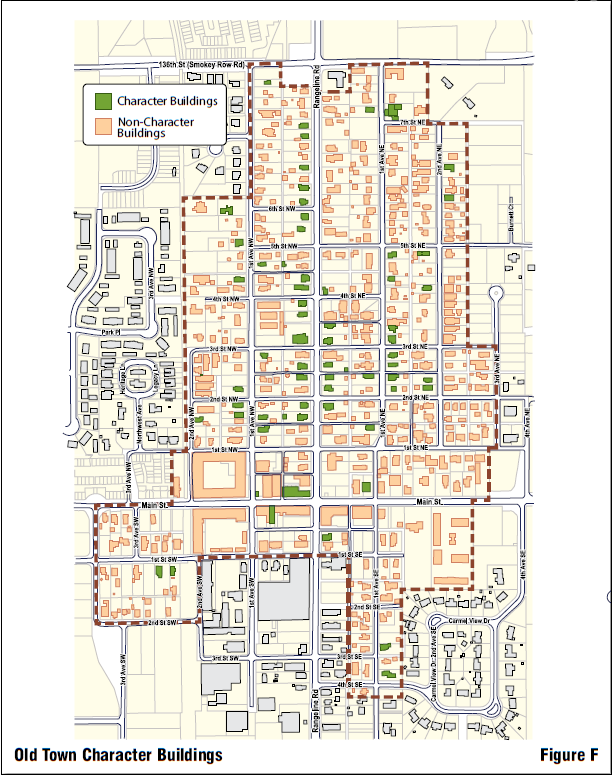 Character Sub-Areas consist of the bulk of the residential areas in the Old Town Overlay District, both east and west of Range Line Road, and both residential and commercial properties facing Range Line Road in the north end of the District. There are many different styles of architecture in this area; however, the consistency and character of the neighborhood is worth protecting. The intent of these regulations is to preserve the character of the neighborhood by preserving certain buildings and siting characteristics.