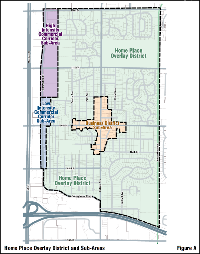 The boundaries of the Home Place Overlay District and its Sub-Areas are hereby established as shown on the Official Zoning Map. The Home Place Overlay District is generally depicted in Figure A: Home Place Overlay District and Sub‑Areas. The Home Place Overlay District is generally bounded by the following streets: to the west by Pennsylvania Street, to the north by East 116th Street, to the east by the Monon Greenway, and to the south by I-465. The Home Place Overlay District is comprised of the following sub-areas.