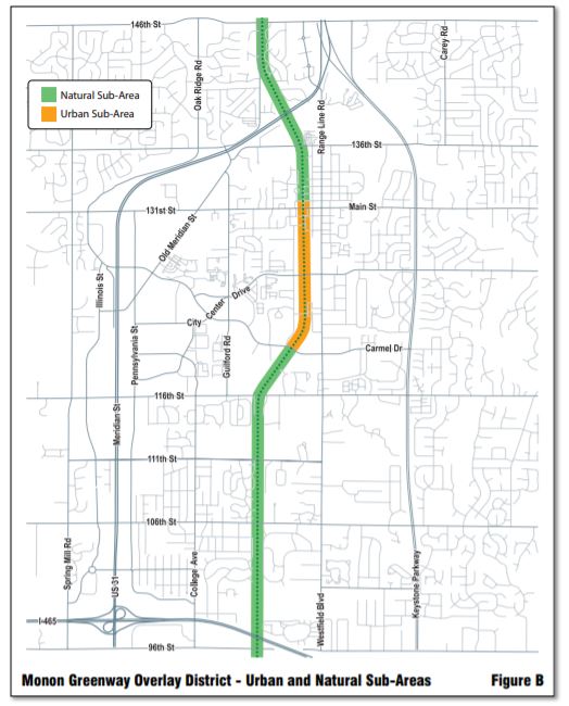 The official boundaries of the Monon Greenway Overlay District and its Sub-Areas are as illustrated on the Official Zoning Map. Generally, the boundaries are illustrated in Figure B: Monon Greenway Overlay District‑ Urban and Natural Sub‑Areas, extending eighty-eight (88) feet from the centerline of the Monon Greenway. The Sub-Areas are further described below.
