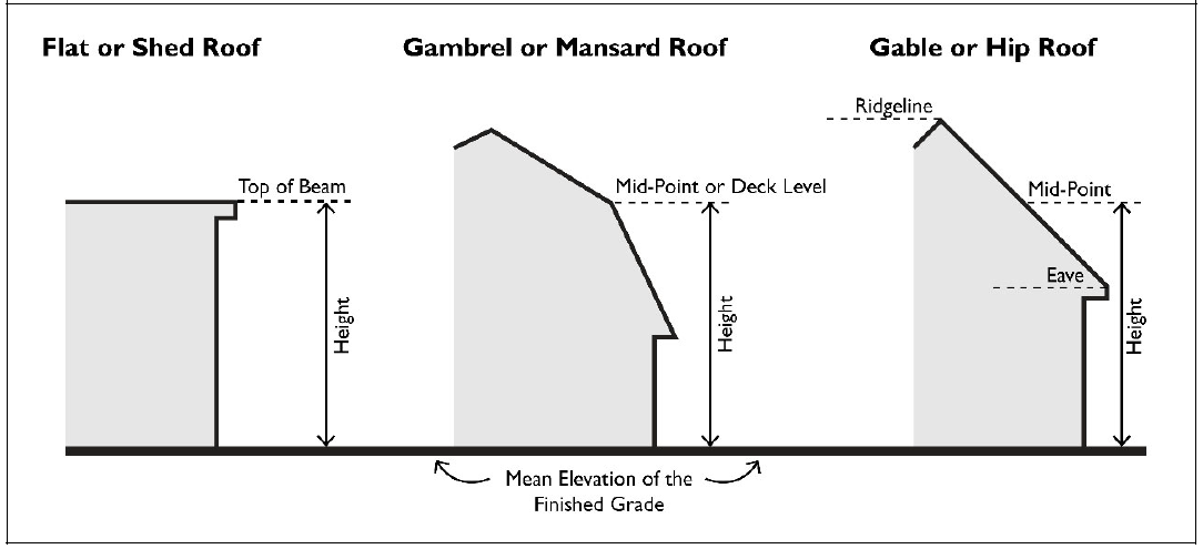 The height of a building shall be the vertical distance measured from the mean elevation of the finished grade at the front of the building to the mid-point between the ridgeline and the eaves of the building for gable, hip and gambrel roofs; the vertical distance from finished grade to the top of the highest roof beams on a flat or shed roof; and to deck level on a mansard roof.