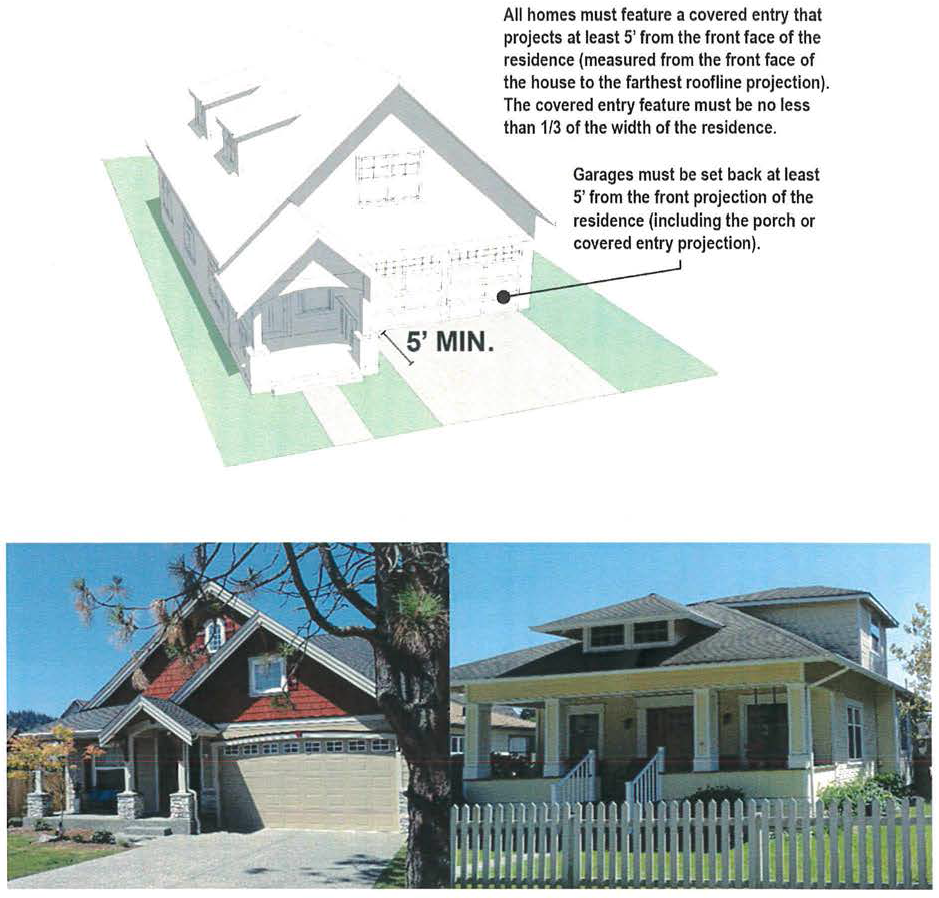 Figure 1. Illustrating covered entry and garage setback requirements. The photographs illustrate two ways of meeting these standards. In the left example (as in the illustration), the garage is placed at least five feet behind the front of the porch/covered entry. The right example includes a full length porch and the garage is located off of the alley.
