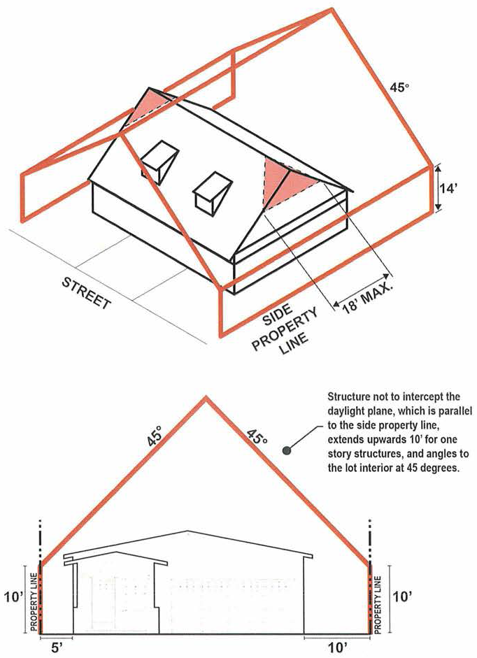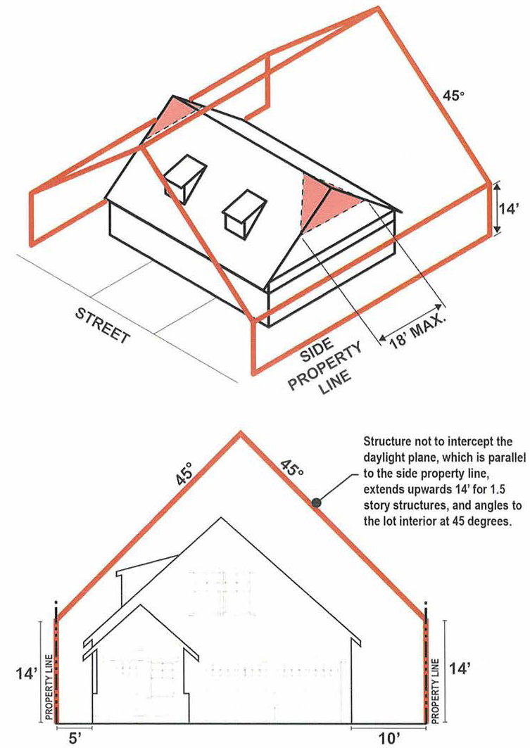 Figure 2. The graphics above illustrate the special side yard height and setback limitations for a one and one-half story residence. The top example includes a gabled roof facing the side property line. The lower example shows the gabled roof end facing the street and rear property line.