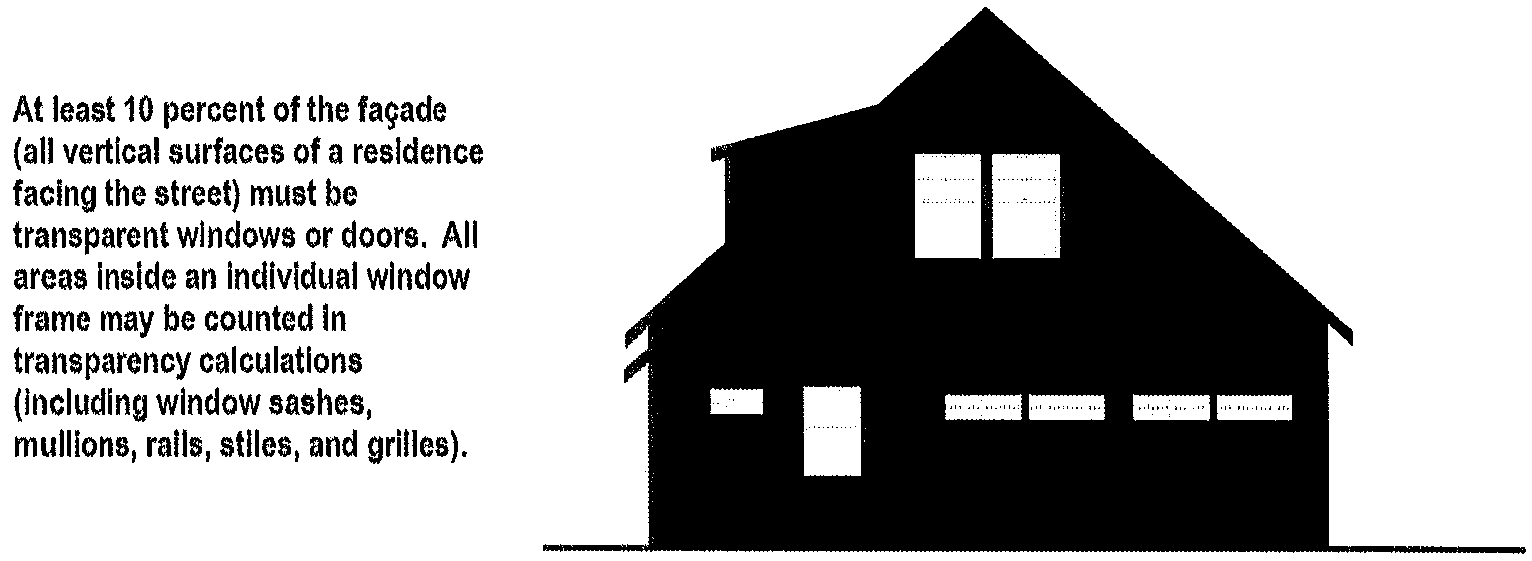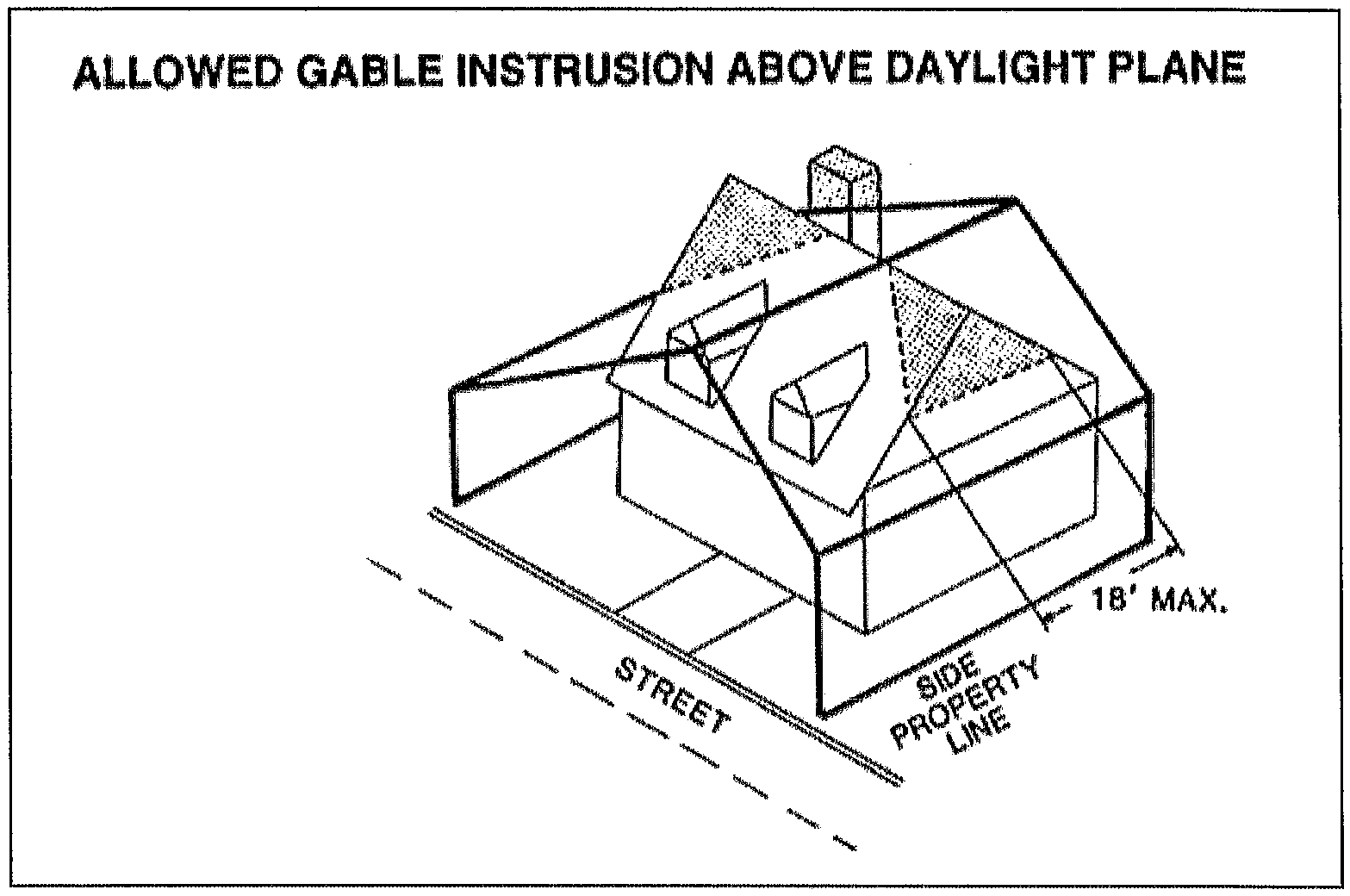 Figure 4. Gables or similar architectural features, provided that the horizontal length of all such features shall not exceed a combined total of eighteen feet on each side, measured along the intersection with the daylight plane, and provided that the intersection of the gable with the daylight plane closest to the front property line is along the roof line.