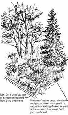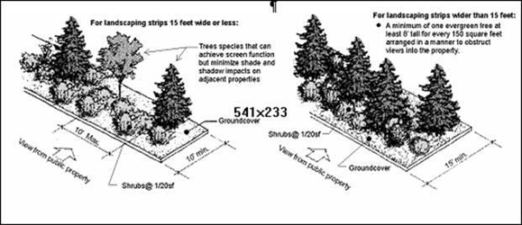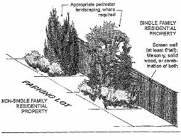 Screening and landscaping between two lots lessens the transmission from one lot to another of noise, dust, and glare.