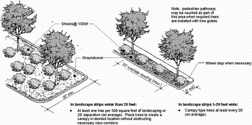 Wheel stops, curbs, or walkways shall be used to protect landscaping from vehicles.