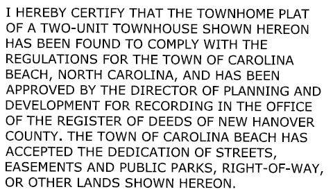 I hereby certify that the subdivision plat shown hereon has been found to comply with the Subdivision Regulations of the Town of Carolina Beach, North Carolina, and that this plat has been approved by an authorized representative of the Town of Carolina Beach for recording in the Office of the Register of Deeds of New Hanover County.