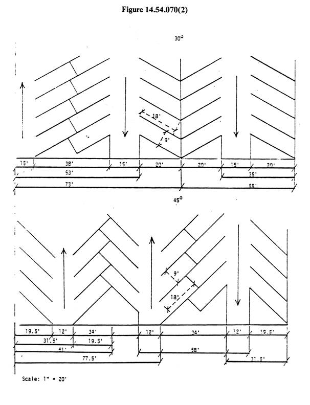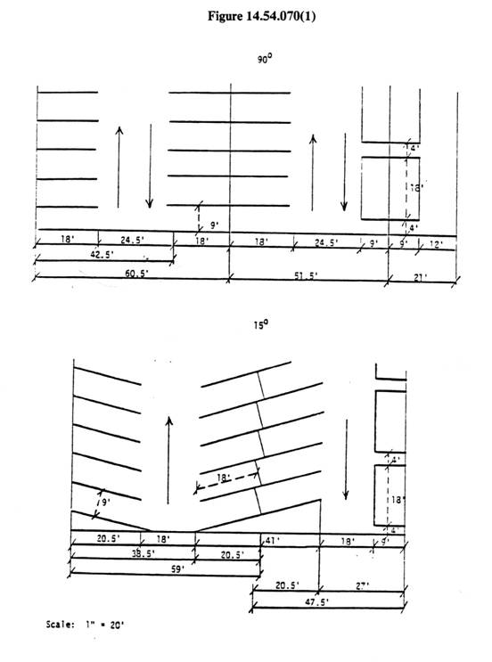 The design of parking spaces and the maneuvering space in connection therewith shall be in accordance with the requirements illustrated in Figures 14.54.070(1) and (2).