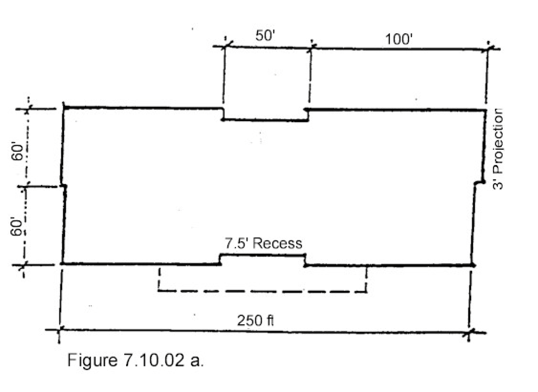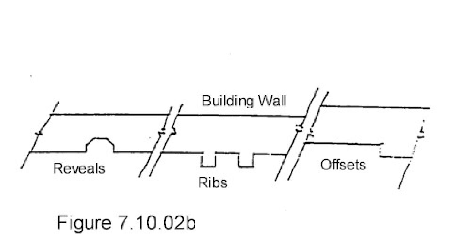 Facades/detail features. No uninterrupted and/or unadorned length of any portion of the facade shall exceed 100 linear feet (this measurement shall not apply to the backs of buildings that are not visible to the public). Interruptions of such continuous lengths of the facade shall include wall plane projections and/or recesses of not less than five feet in off-set, and a minimum of 20 feet in length, and one or more of the following: Architectural features such as pilasters; columns; canopies/porticos; arcades, colonnades, and/or parapets (See Figure 7.10.02.a). All facades shall include repeating patterns at intervals of no more than 30 feet, horizontally or vertically. Such repeating patterns shall include windows, color changes, texture changes, material module changes, and/or surface modeling changes such as, reveals, or ribs of no less than 12 inches in width (See Figure 7.10.02b).