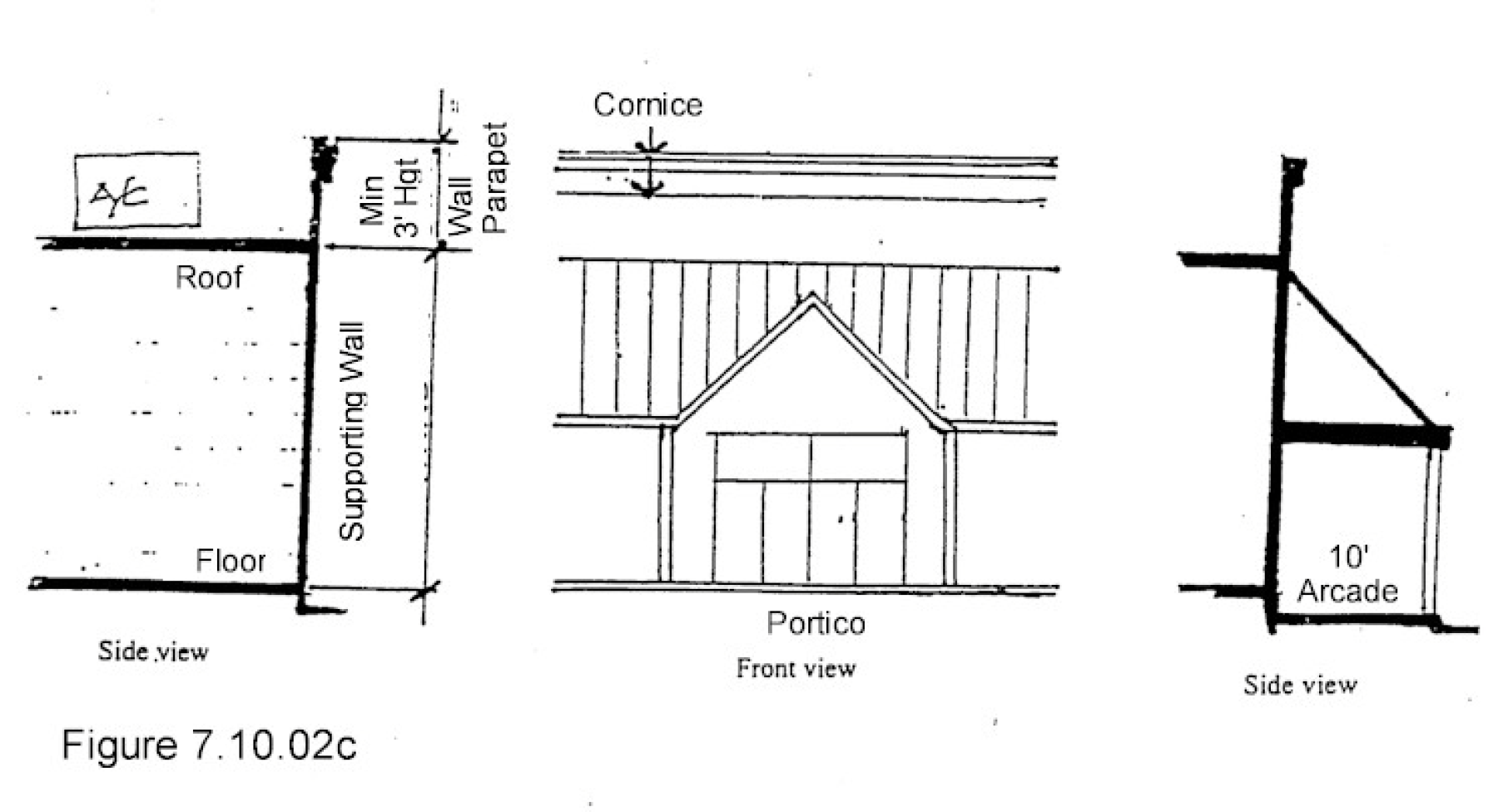 Roofs. Flat unarticulated roof lengths, longer than 100 feet in length shall be concealed or addressed by utilizing at least two of the following options (See Figure 7-10-02c):
