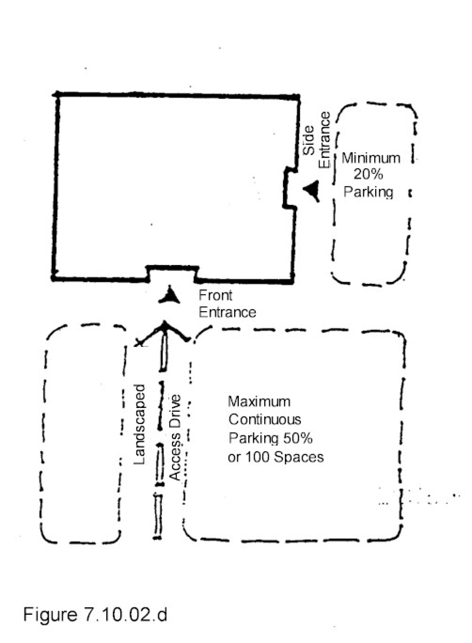 Parking lot design. Vast, unbroken parking lots are prohibited. Parking areas shall be designed so that no more than 100 spaces of the total required spaces are part of a clearly defined grouping of spaces. Such groups shall be broken into individual lots and/or clearly separated by well landscaped or weather-protected pedestrian walkways, significant landscape or geographic features, and/or by design components of the proposed building(s). Separations shall be no less than eight feet in width at any point. No required parking space shall be located further than 500 feet from the nearest customer entrance. At least 20 percent of the required parking spaces shall be placed in the rear or side areas of the proposed development, if feasible, as determined by the administrator. Alternative designs that incorporate existing natural resources are encouraged, subject to approval by the administrator.