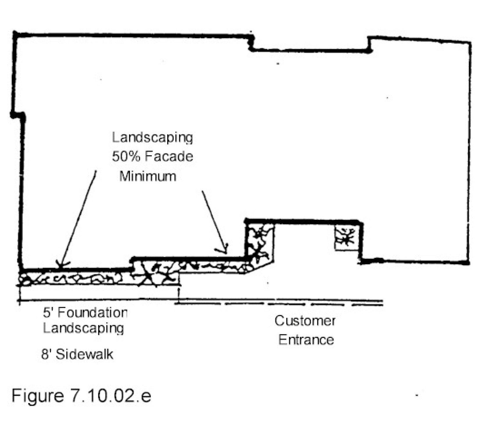 Foundation. Foundation landscaping shall be required for at least 50 percent of each facade length located along a public right-of-way, parking area, or which includes a customer entrance (See Figure 7.10.02.d). Such landscaping shall be incorporated into a minimum of a five-foot wide landscaped bedding area located between, and in addition to the required building sidewalk and the first vertical wall of the building facade. Large commercial planters or alternative designs may be used to meet these criteria (See Figure 7.10.02.e).