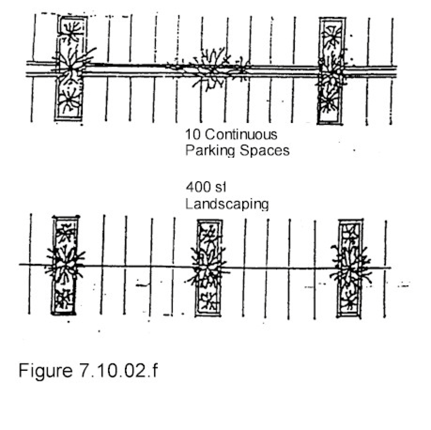 Parking areas. Every ten spaces shall be designed with 400 square feet of landscaping to be placed in medians or islands, and shall include at least one over-story tree, one under-story tree and six shrubs. No median shall be less than five feet in width, and no more than ten spaces shall be continuous without landscaping (See Figure 7.10.02.f). Grouping of landscaped islands is encouraged to promote the healthy growth of larger trees. Alternative designs are subject to approval by the administrator, but in no case shall the total required landscaping area be decreased.