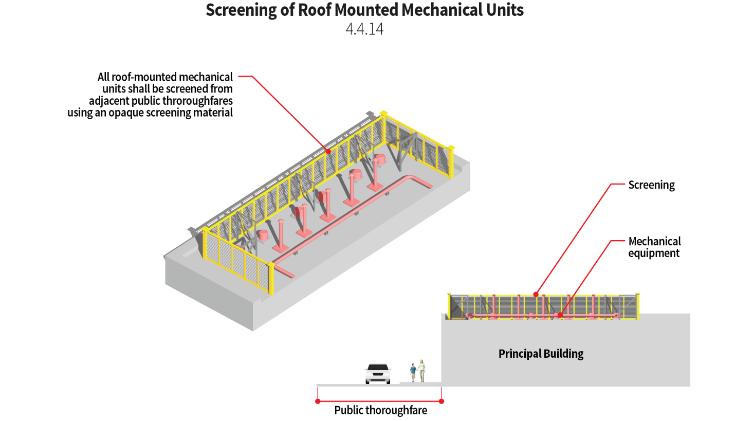 Utility structures and service. Whenever possible, on-site electric, telephone and cable lines shall be placed underground. Transformers and other similar equipment shall be visually screened from the road by landscaping. Utility meters shall not be installed on the front or corner side facades of a building. Wall-mounted utility meters shall be painted to match the building. Meters shall be visually screened from the road by landscaping.