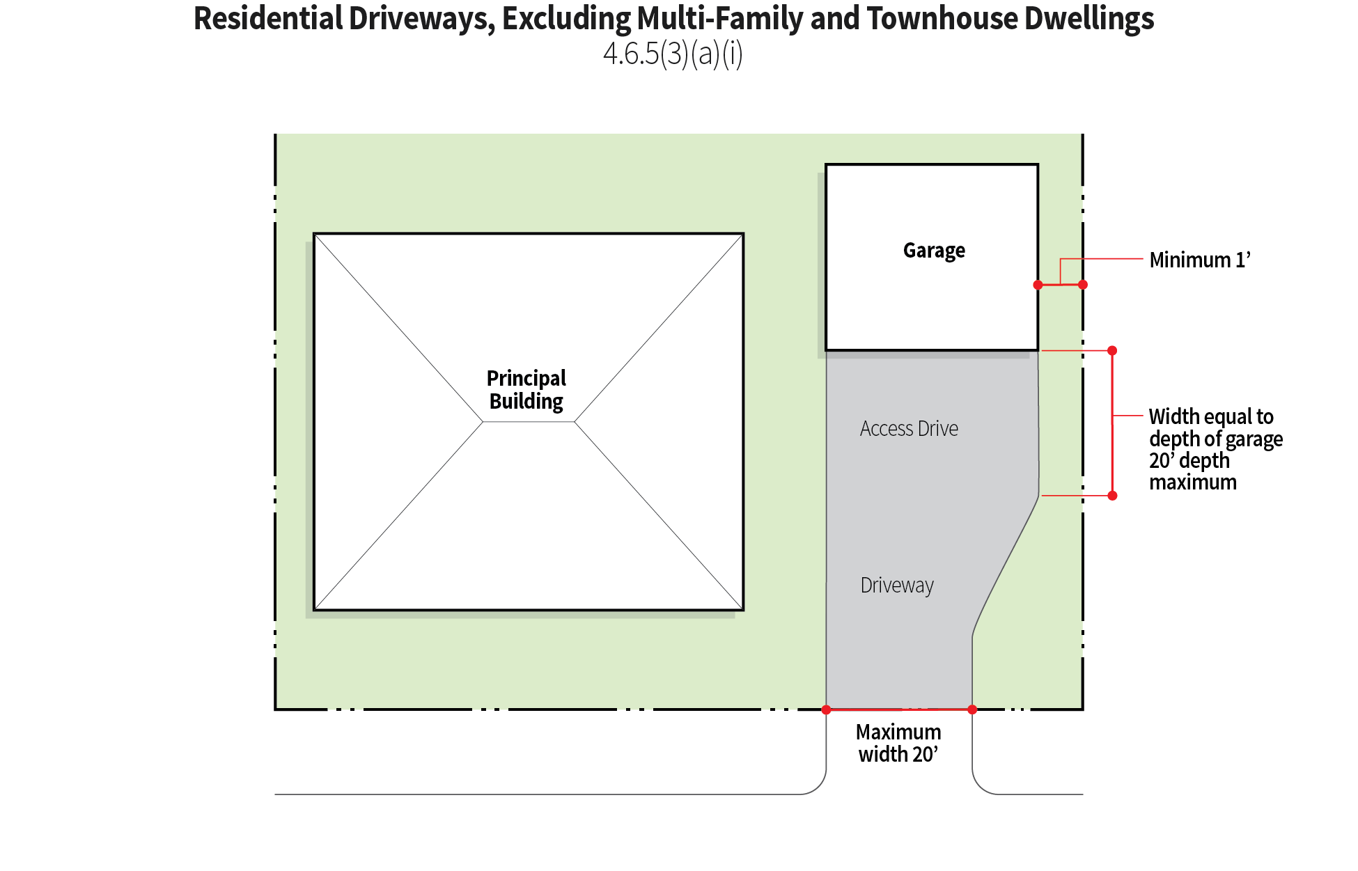 A residential driveway that provides access to an attached garage shall be no wider than the width of the garage or twenty-six (26) feet, whichever is greater. A residential driveway that provides access to a detached garage shall be no wider that the width of the garage or twenty (20) feet, whichever is greater. A garage access drive, the width of the garage as measured from the garage walls, is permitted to extend for a distance (depth) of twenty (20) feet from the garage doors before tapering back to the required driveway width to allow access to the additional spaces.
