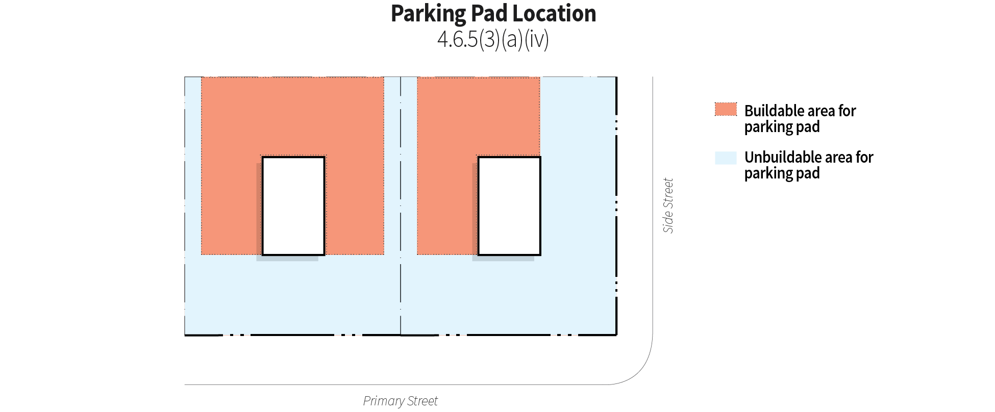 Single-family and two-family dwellings are permitted an additional paved parking pad. Such parking pads shall not be located in the front or exterior side yard or setback, or within the required interior side setback. Any driveways must comply with the requirements of paragraph ii above. The minimum impervious surface requirement for the lot may not be exceeded to accommodate a parking pad. The figure below illustrates where a parking pad may be located.