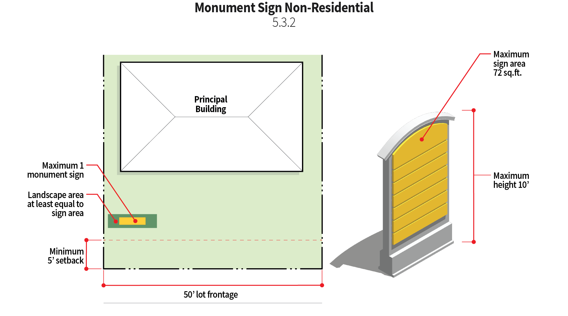 Setbacks. No part of any monument sign may be closer than ten (10) feet from any street right-of-way or property line. Signs for non-residential uses shall be setback at least one (1) foot for each one (1) square foot in sign area from the nearest residential property line.
