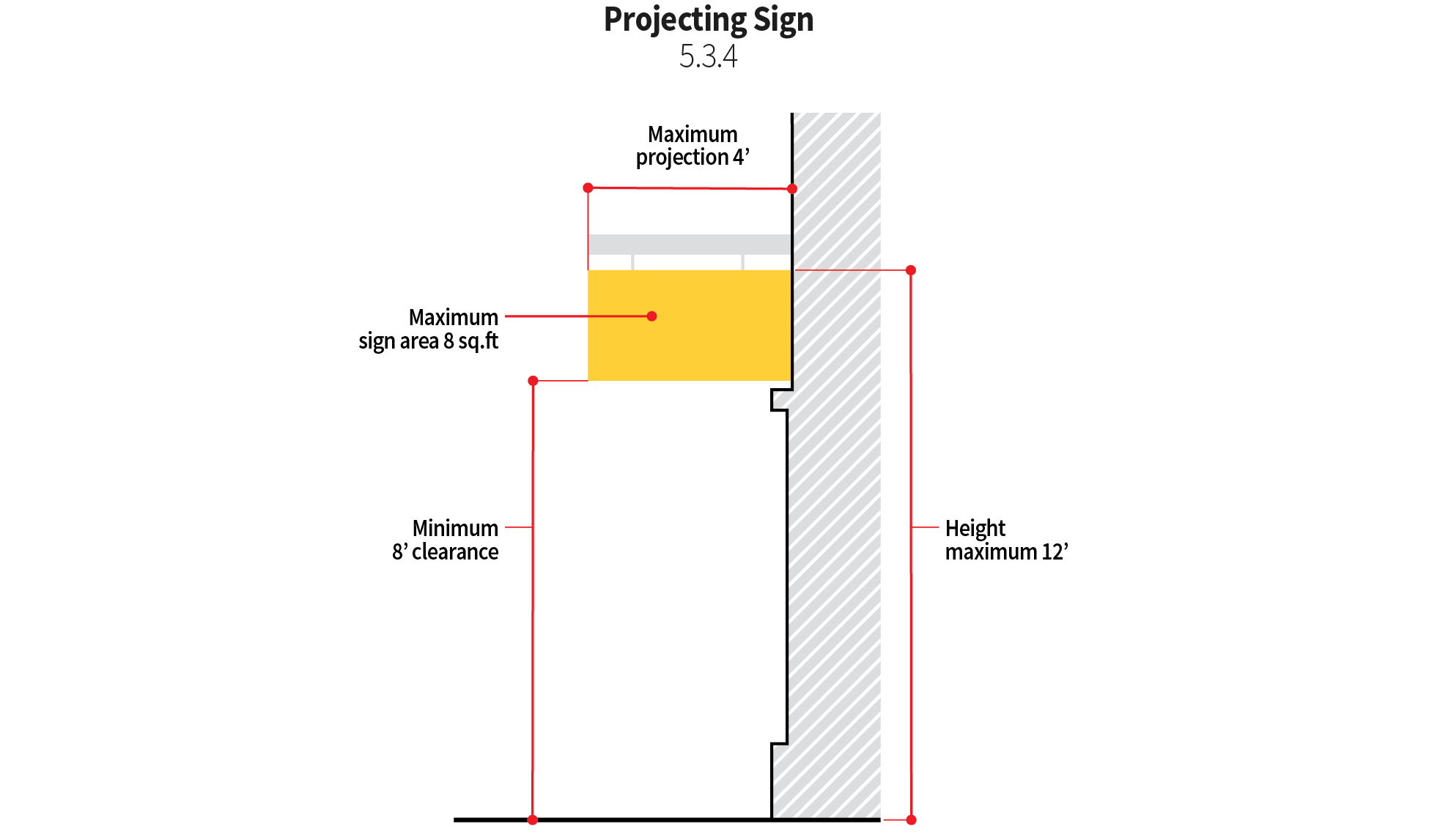 Height. Projecting signs shall no extend above the roofline of the building to which it is attached, or twelve (12) feet as measured from the existing ground or grade level directly below the sign. A minimum of eight (8) feet clearance shall be maintained from the lower edge of the sign face to grade.