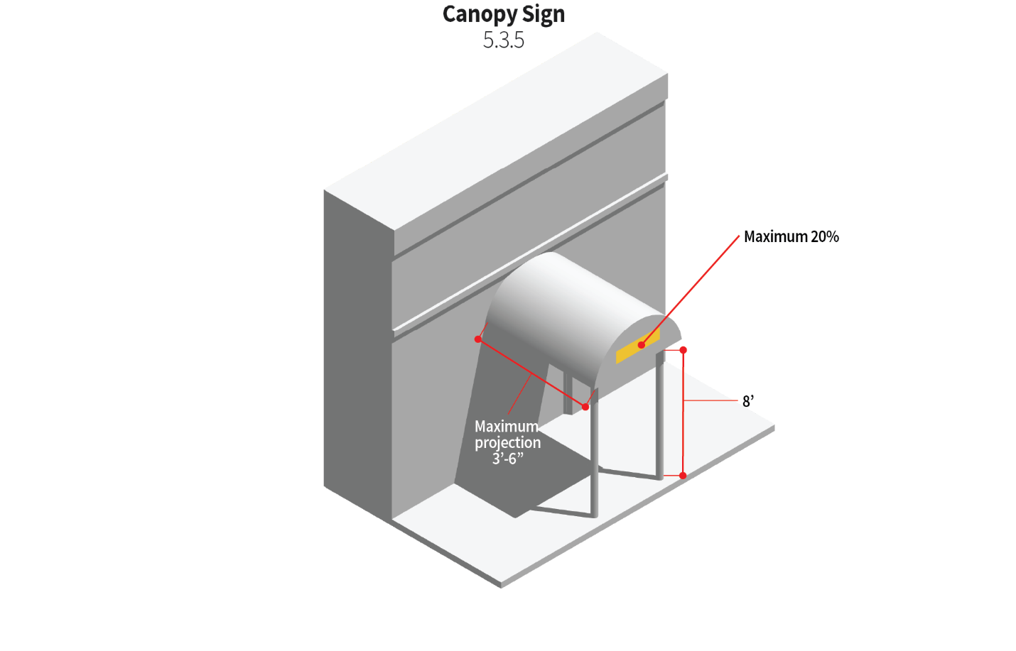 Height. All canopies and awnings shall be constructed and erected so that the lowest portion of the projecting frame shall be not less than eight (8) feet above the existing monument or grade level, and the lowest portion of the extending skirt shall be not less than seven (7) feet six (6) inches above the existing monument or grade level.