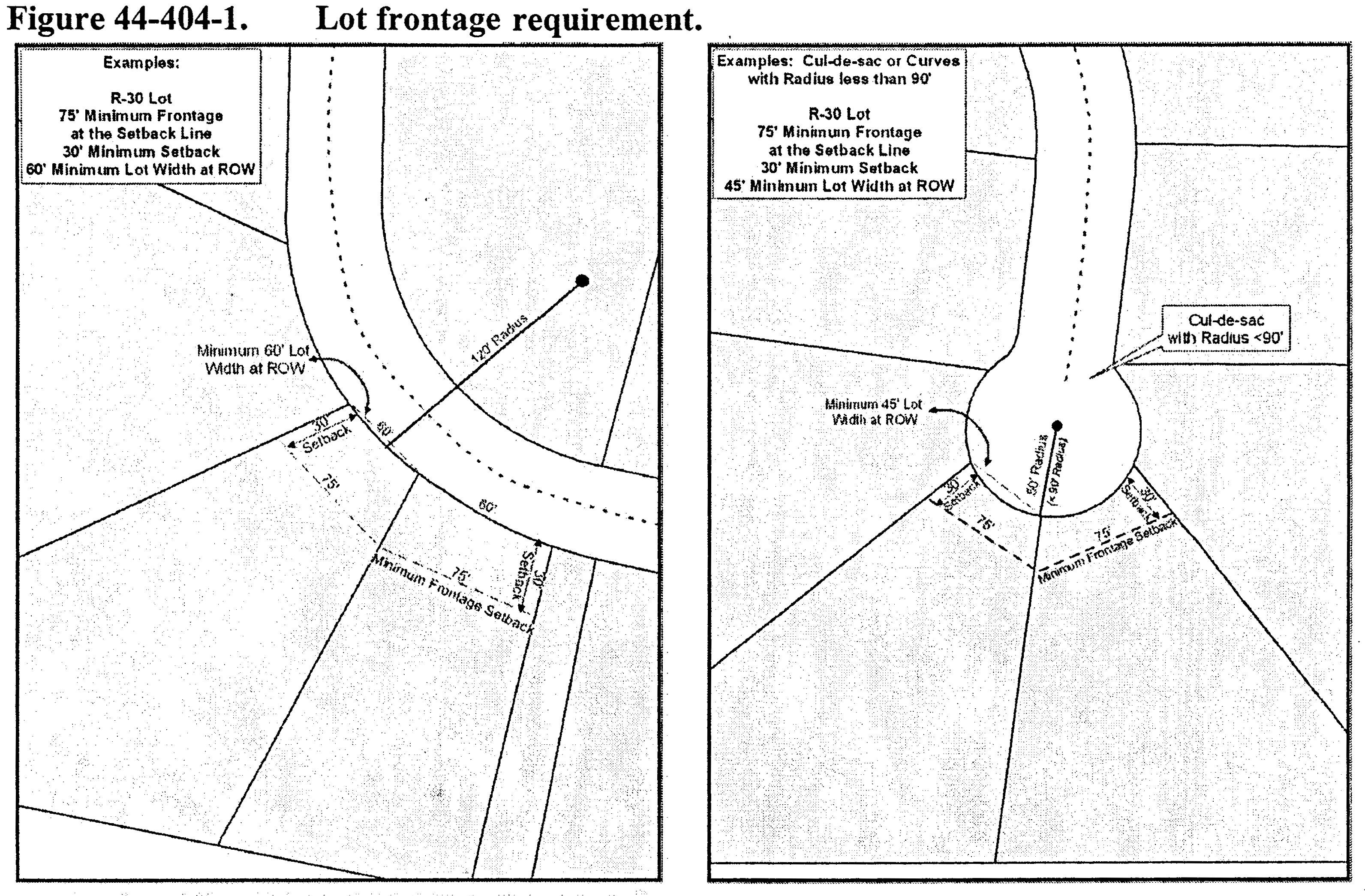 Lot frontage. Lot frontage shall not be less than 80 percent of the required minimum lot width except for lots on the turning circles of culs-de-sac or at similar points of street curvature where the radius of the right-of-way line is less than 90 feet. In the case of a cul-de-sac or where a right-of-way radius is less than 90 feet, the minimum frontage shall be 45 feet. Figure 44-404-1 indicates the relationships involved.