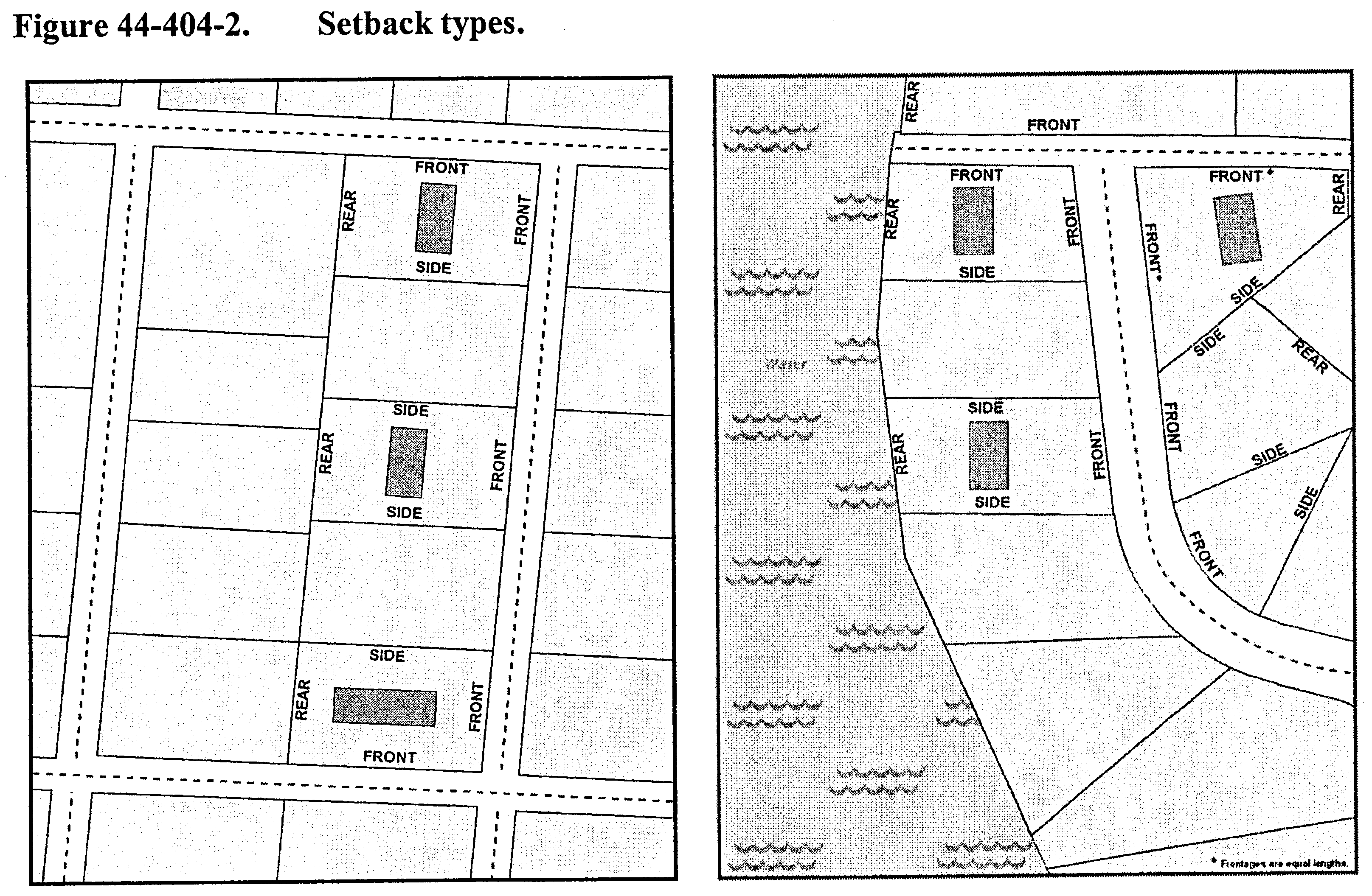 Front setbacks. The front setback is an imaginary line extending the entire width of the lot and parallel to the front lot line. The setback requirement in table 44-404-1 is measured perpendicular to the front lot line at the closest point to the front lot line.
