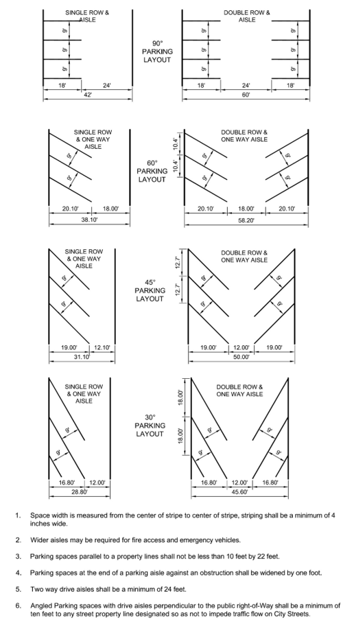 All units that have 10 or more parking spaces shall designate parking by painted lines or other approved methods. All parking lots that have 60 or more parking spaces and have combined access driveways for ingress and egress to and from a public street shall have a painted centerline on the driveway that is 30-feet long and extends from the street into the parking lot.