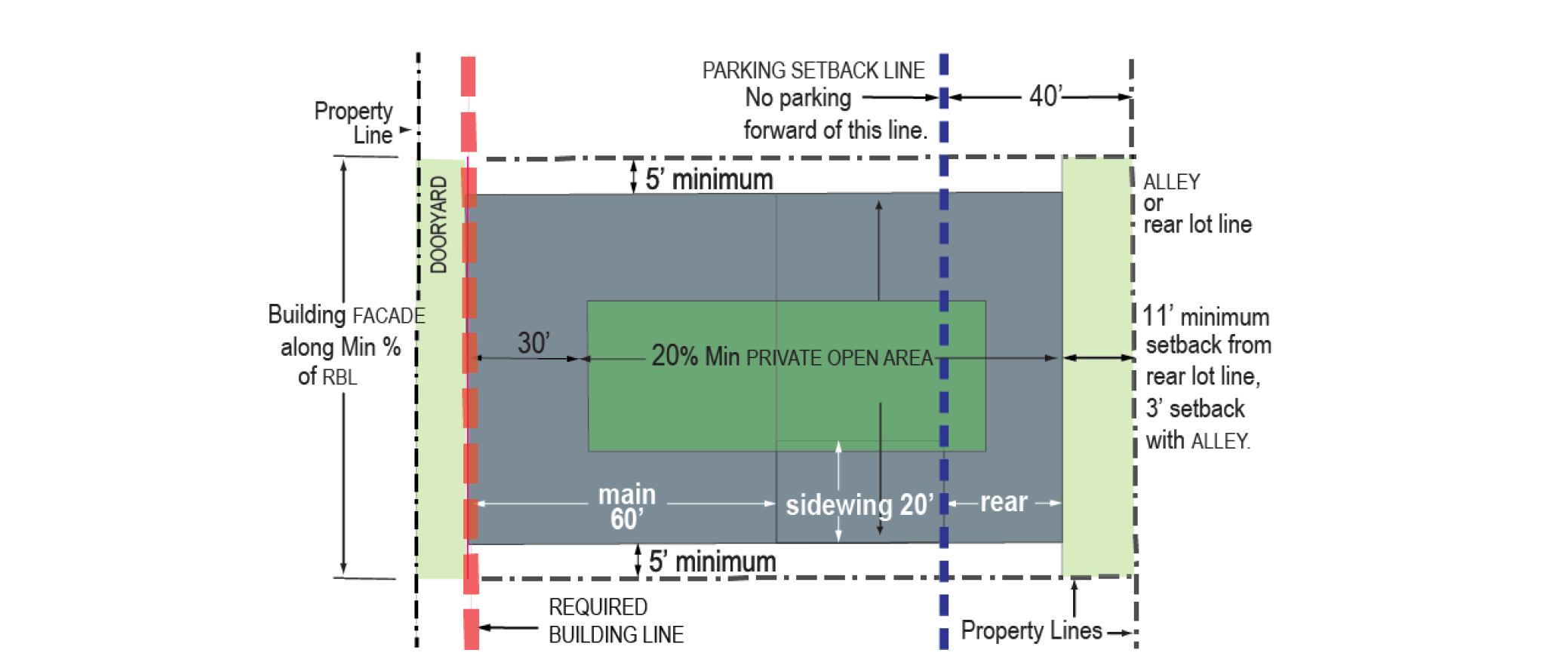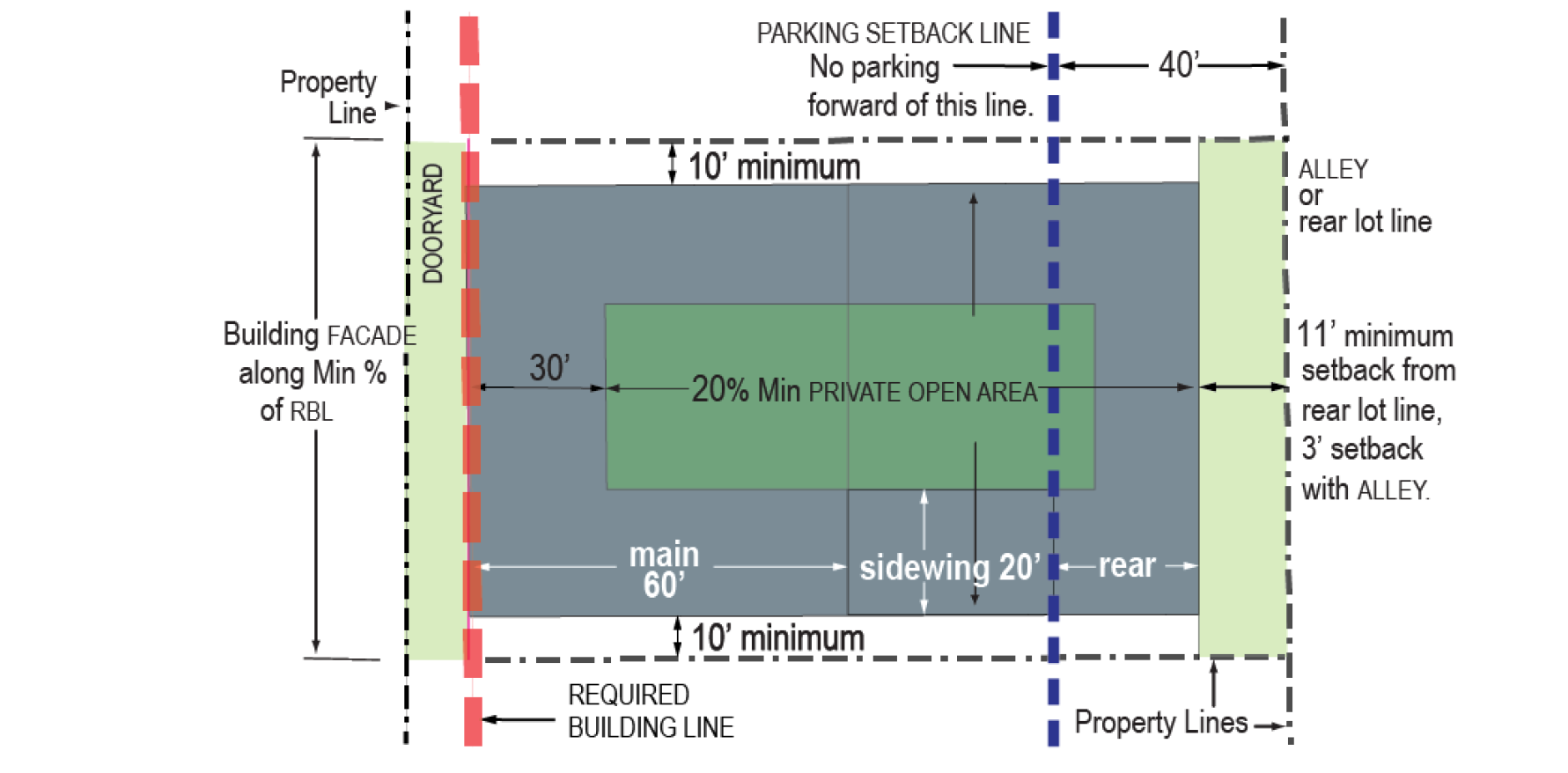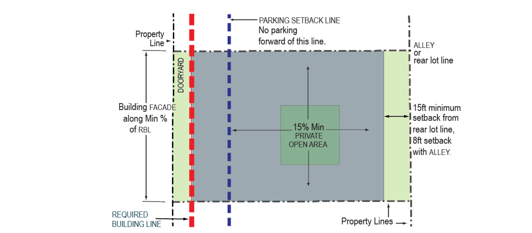 The front yard and the required side yards shall be provided in accordance with the underlying zoning district. The front yard, the required front yard and the required side yards may be used for access to the parking lots, for fences, walks or landscaping only. No vehicular parking is permitted in the front yard, in the required front yard or in the required side yard.