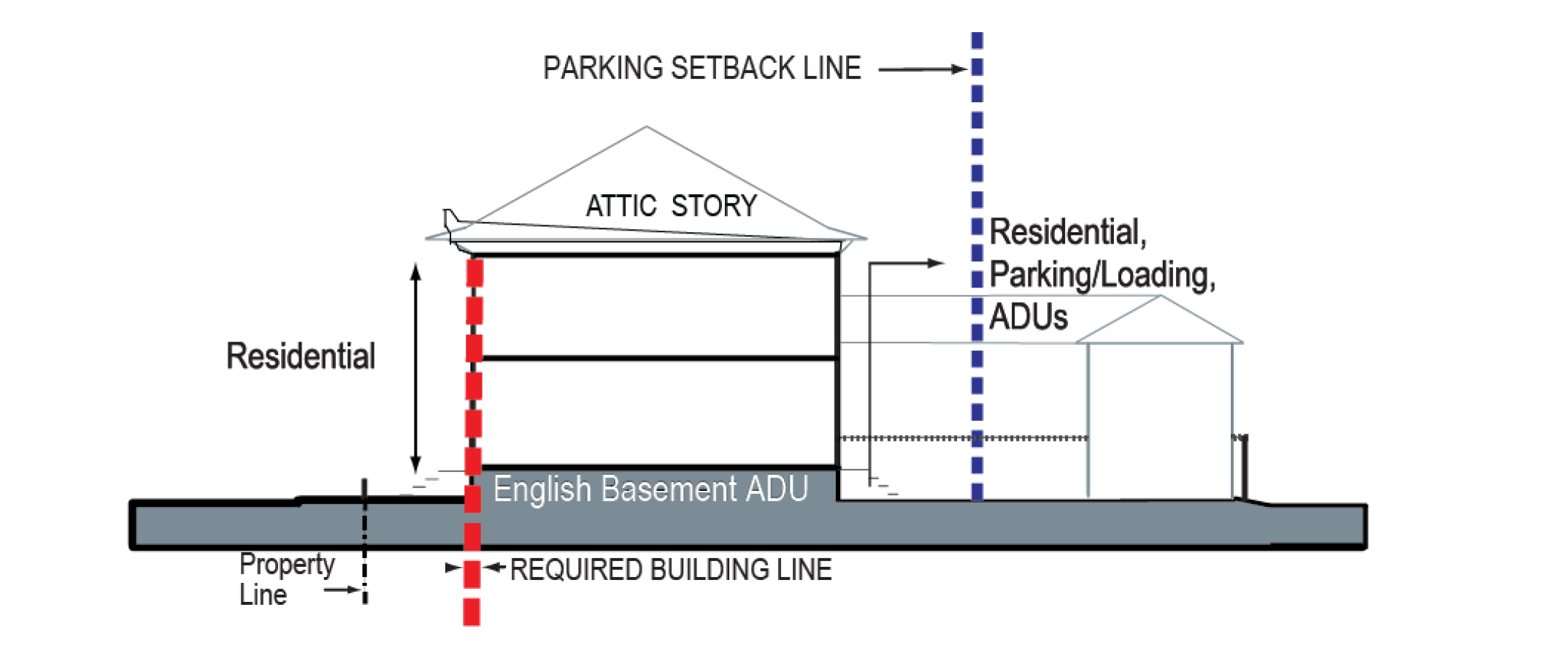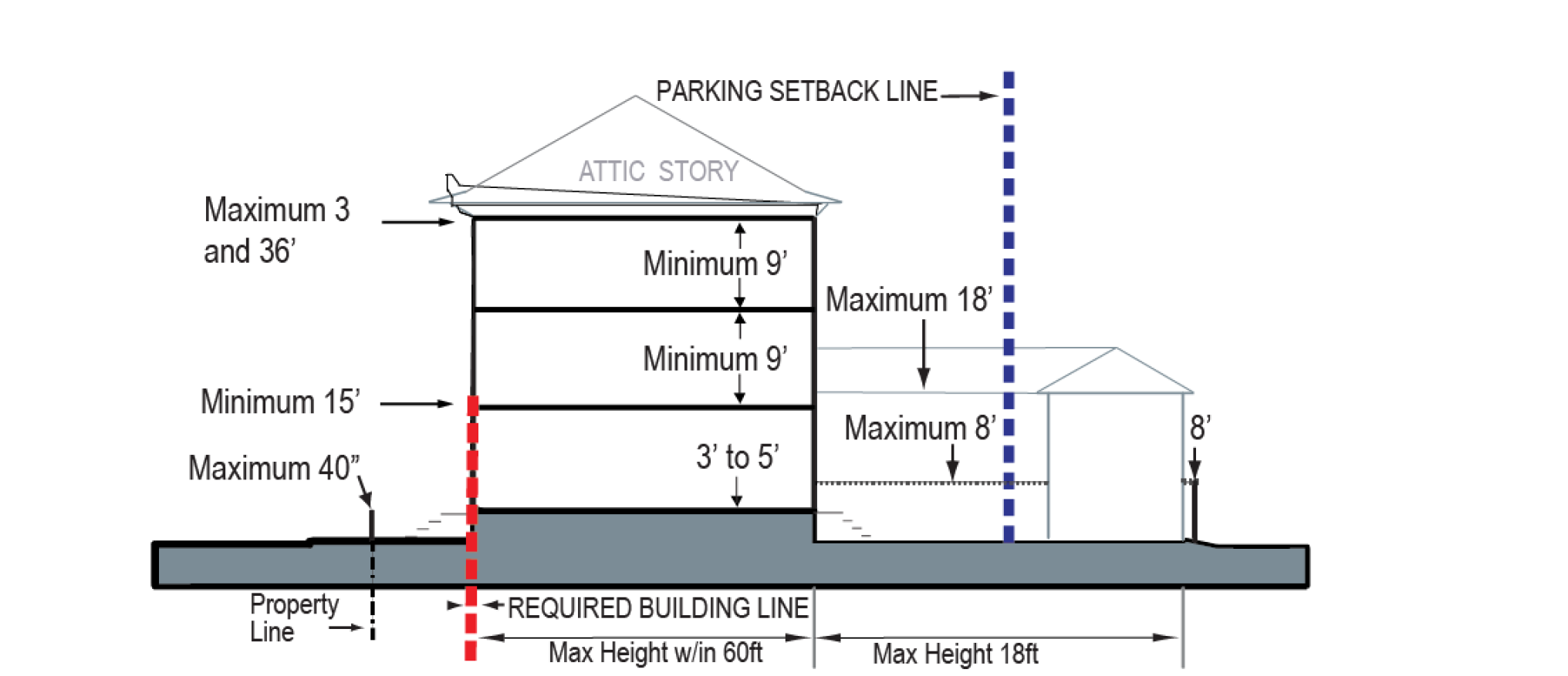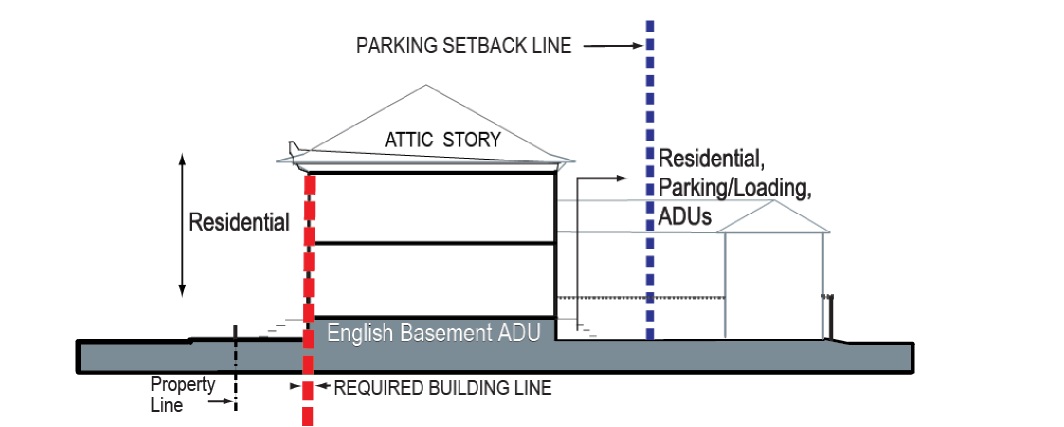 The front yard and the required side yards shall be provided in accordance with the underlying zoning district. The front yard, the required front yard and the required side yards may be used for access to the parking lots, for fences, walks or landscaping only. No vehicular parking is permitted in the front yard, in the required front yard or in the required side yard.