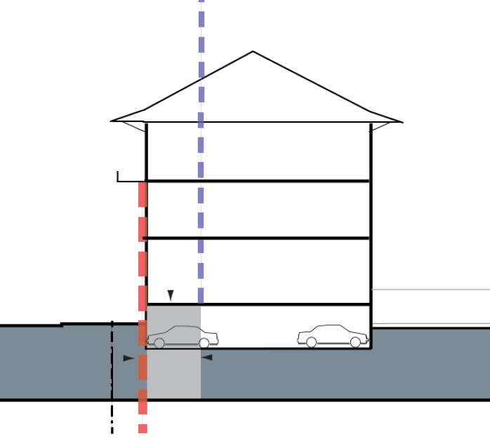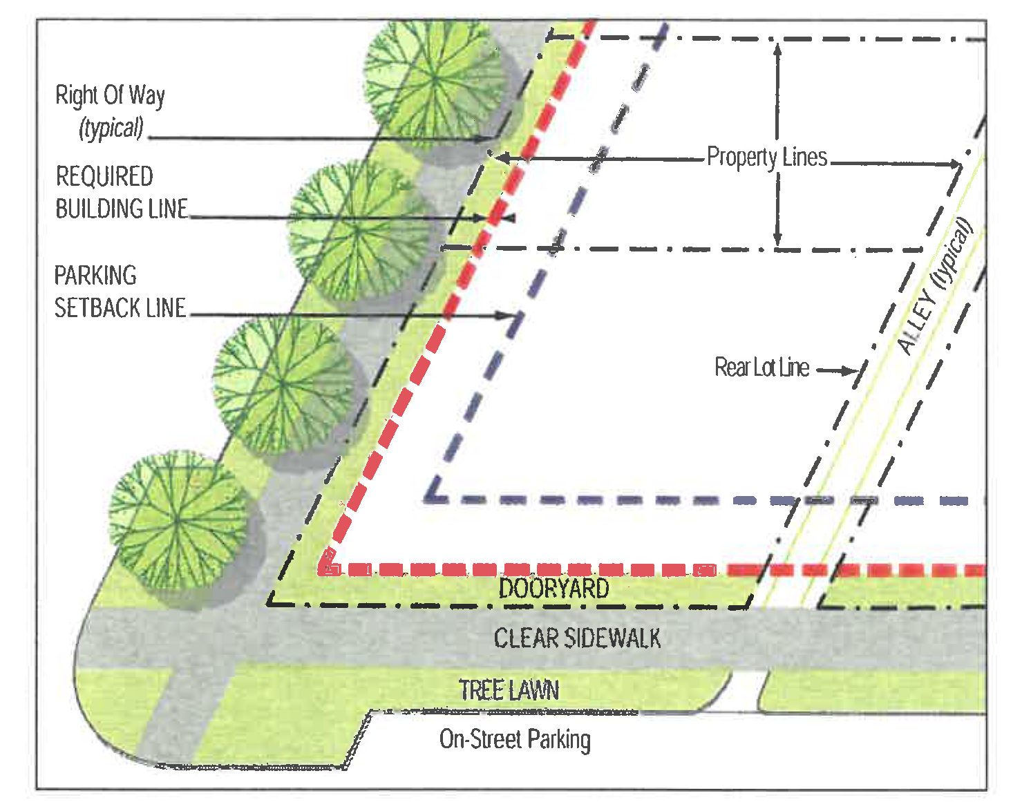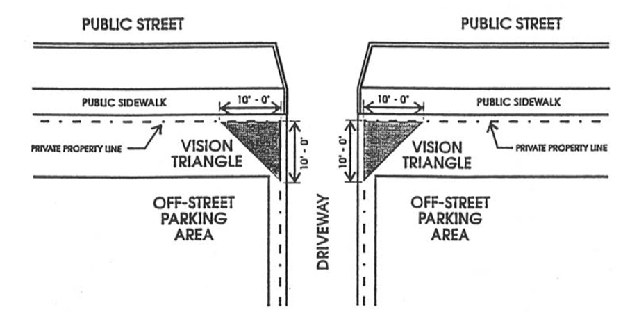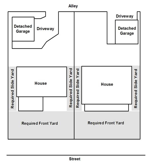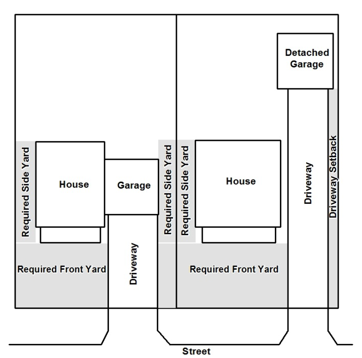 An access from the public street, maintaining a three-foot setback from the property line (see section 19-223), that is established to provide vehicular parking at a single-unit or two-unit residential dwelling. It may also provide access to an attached residential garage, or to a detached residential garage in the rear yard area of the property. Refer to figure 5. In the situation in which the existing driveway does not meet the three-foot setback, and if strictly enforced would cause the driveway width to be less than ten feet, a reduced driveway setback may be permitted if approved by the zoning administrator.