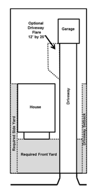 Not located toward or in the interior of the lot (i.e., area in front of residence). Flare outs are not allowed on both sides of a driveway unless one common driveway is serving both units of a duplex residence.